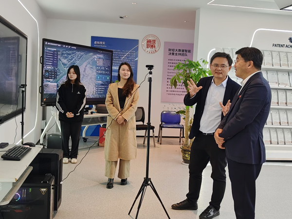 邓辉和方玉明先后查看了展板和展厅,详细了解了展厅各版块展出内容,与相关研发人员进行了交流,了解相关研发成果的实际用途和应用场景。两位领导对于财经大数据教育部工程研究中心的研发成果和展厅的设计给予了肯定,并勉励要尽可能将相关研发成果应用于生产生活实际,为地方经济和社会发展服务。